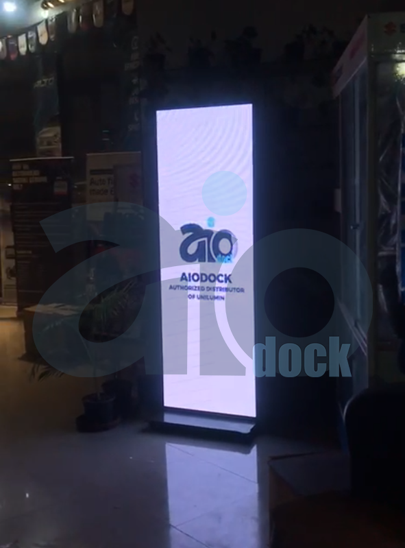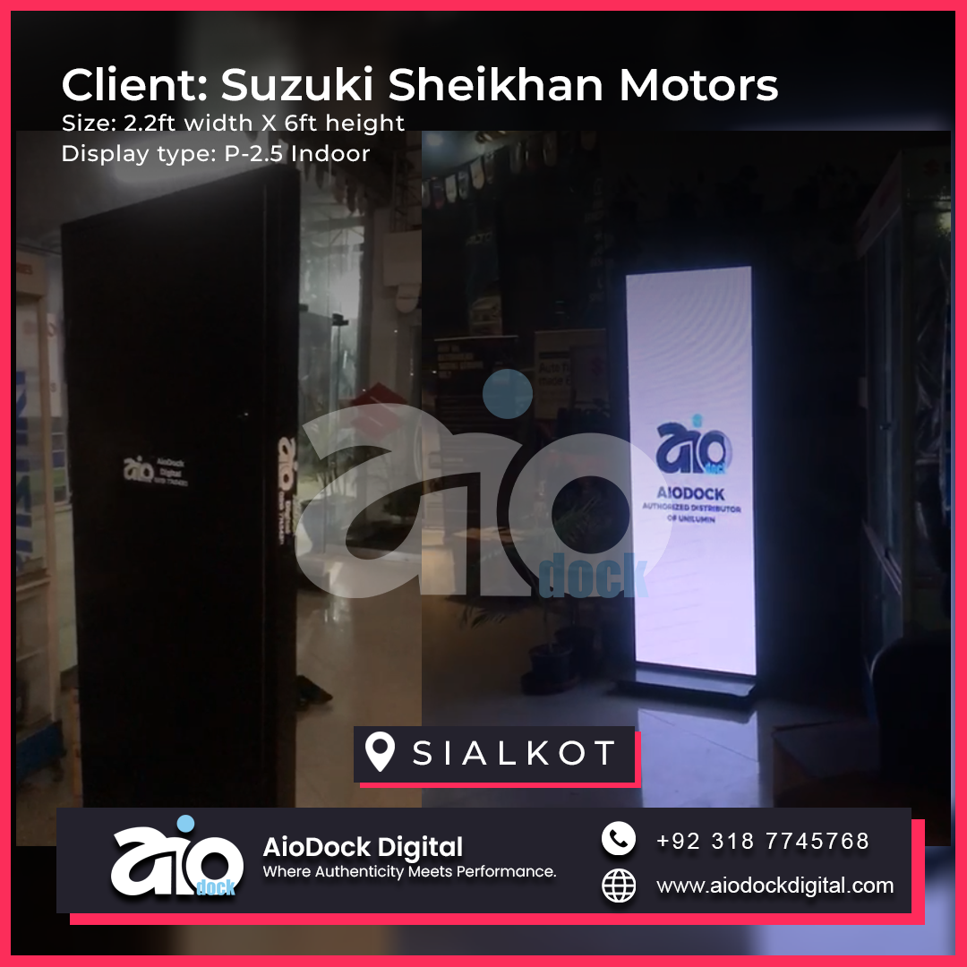 AioDock Digital installed a P-2.5 Indoor LED Display at Suzuki Sheikhan Motors in Sialkot, with dimensions of 2.2 feet in width and 6 feet in height. This high-resolution display delivers crisp and vibrant visuals, making it an effective tool for showcasing promotional offers, vehicle specifications, financing plans, and important dealership announcements.